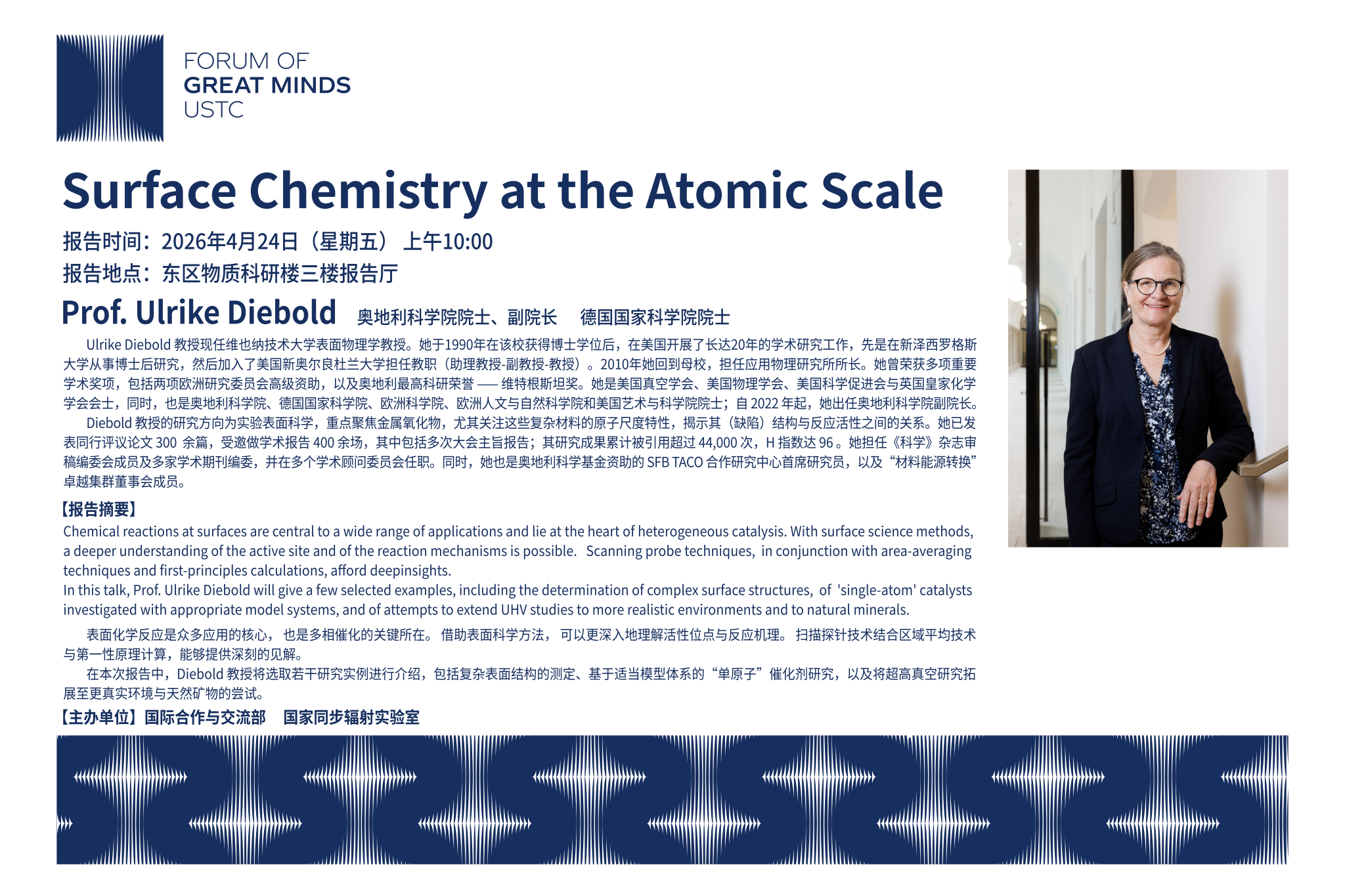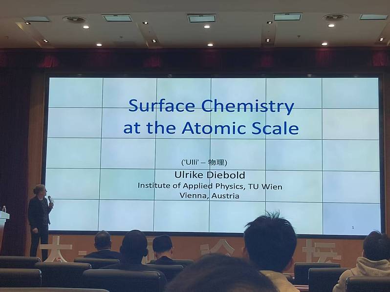 4月24日上午,应国家同步辐射实验室邀请,奥地利科学院院士、副院长,德国国家科学院院士Ulrike Diebold教授到访我校,在东区物质科研楼三楼报告厅作了题为“Surface Chemistry at the Atomic Scale”的精彩学术报告。Diebold教授结合扫描探针技术、平均谱学手段与第一性原理计算,系统介绍了复杂表面结构解析、单原子催化剂模型体系研究,以及超高真空实验向实际环境与天然矿物拓展的最新进展。报告现场气氛热烈,师生们就相关前沿问题与Diebold教授进行了深入交流。